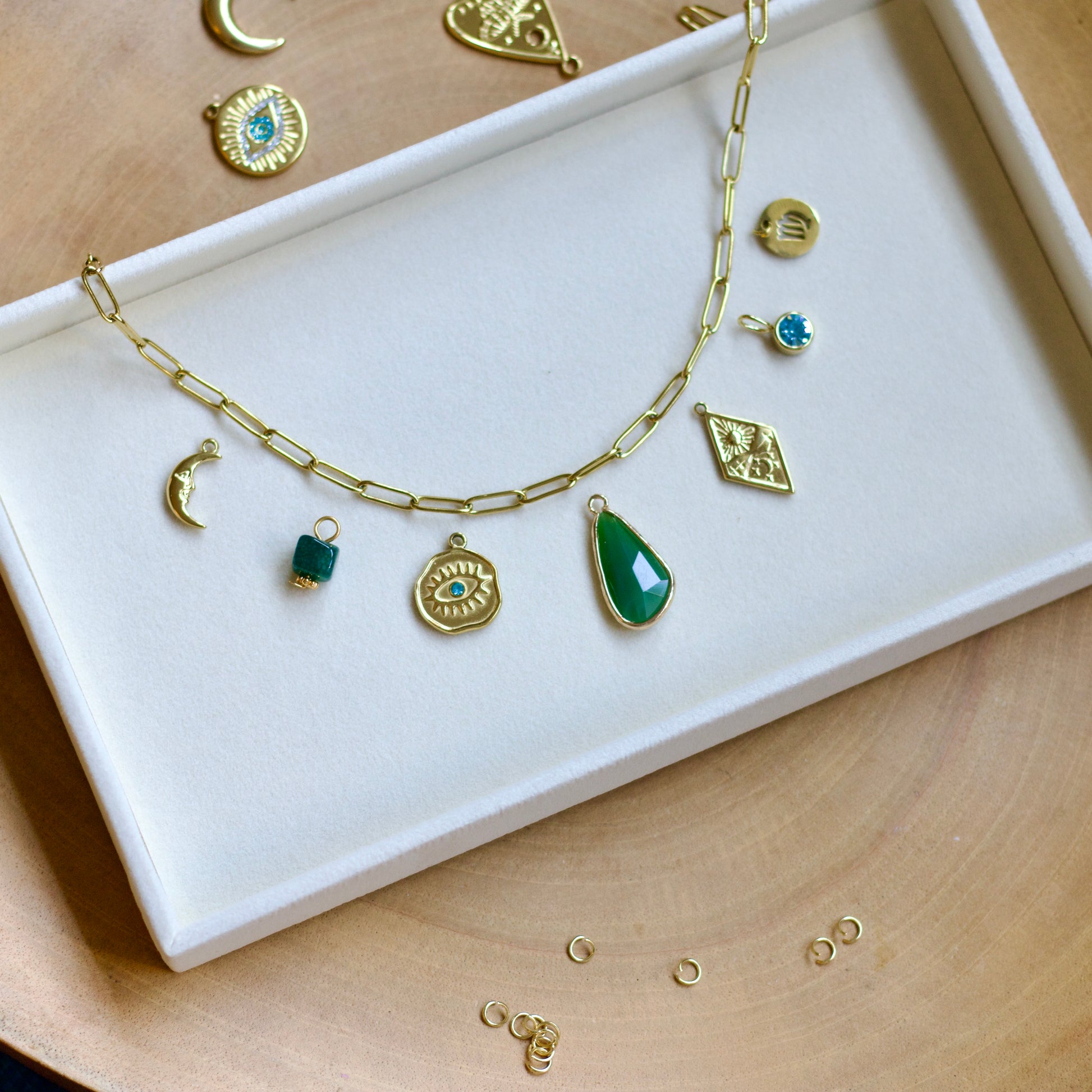 You'll have a huge variety of stunning charms, chains, and tools at your finger tips for crafting the perfect personalized necklace for yourself - or a meaningful gift for someone special! Choose between a gold or silver stainless steel chain and pick up to 10 charms. All materials are hypoallergenic!